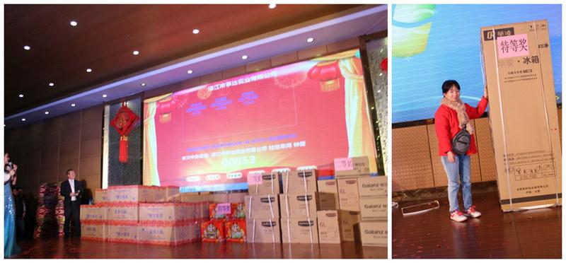 激動人心的抽獎活動令現(xiàn)場氣氛達到最高潮。當大屏幕滾動起來的時候,臺下的觀眾緊張、興奮地倒數(shù)三二一,個個屏住呼吸,都希望幸運降臨在自己身上。一輪又一輪,豪禮送不停。特等獎1名,一等獎2名,二等獎10名,三等獎20名,四等獎200名,中獎機會多多,獎品有大冰箱,微波爐,電磁爐,電壓力鍋等等。到此,大家都伸長脖子想知道,最終特等獎大冰箱花落誰家?沒錯,是質(zhì)量部的黃婉鸝從在場近600名的員工眼皮下一舉奪走了價值兩千多塊的冰箱,成為今年的幸運兒。恭喜恭喜!