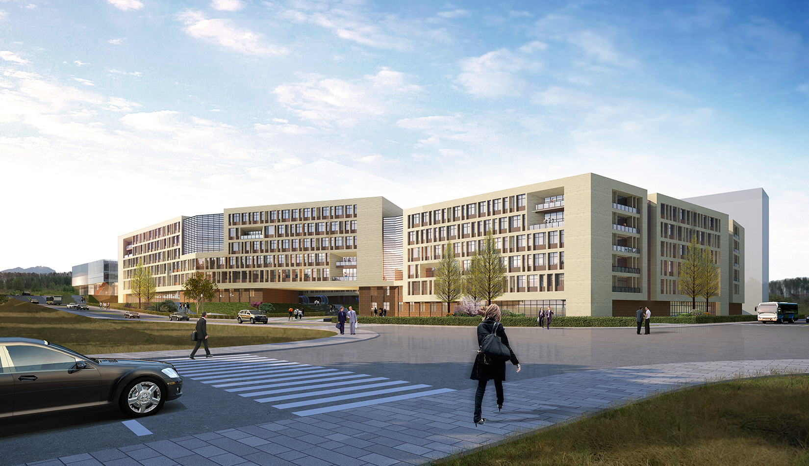 西區(qū)生活區(qū)順應(yīng)歐式建筑布局,采取 軸線景觀 設(shè)計(jì)手法,體現(xiàn)規(guī)整與有序的園林藝術(shù)特色。結(jié)合臺(tái)地景觀的設(shè)計(jì),營(yíng)造大氣的室外空間。庭院設(shè)計(jì)主要以規(guī)整式布局為主,另在主樓后部林區(qū)采用自然式布局,做到規(guī)整與自然式相結(jié)合,在山水之間為學(xué)生提供良好的學(xué)習(xí)環(huán)境。