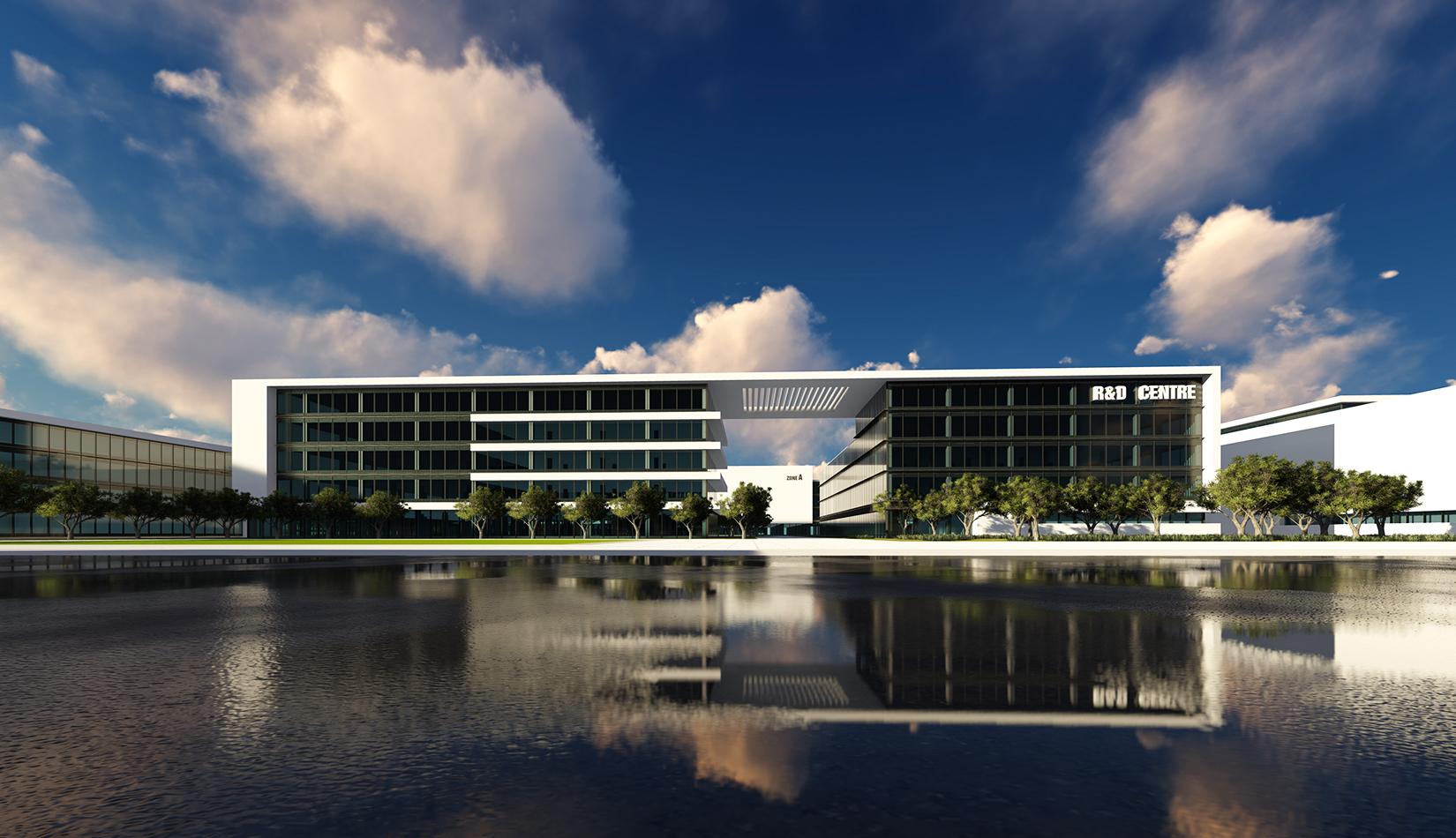 以芯片雙核“互聯(lián)互通” 為基礎(chǔ)概念,轉(zhuǎn)化為建筑空間,形成與世界接軌,和諧五環(huán)的理念。立面上抽象出3D打印機(jī)的形態(tài),使建筑具有現(xiàn)代雕塑感。