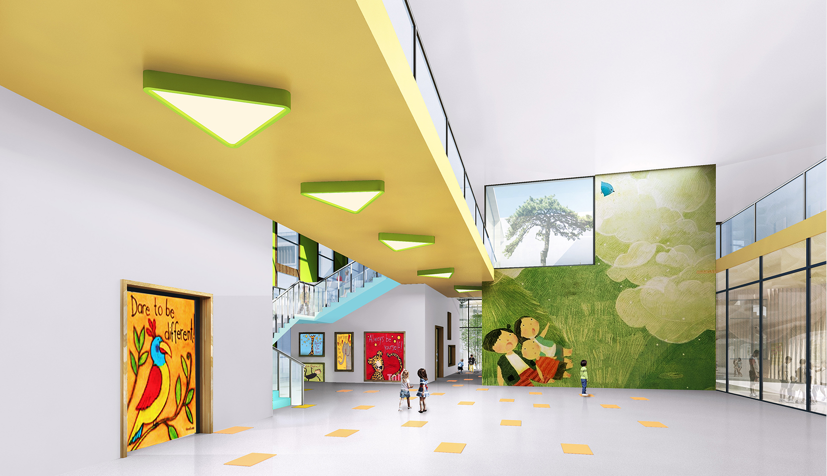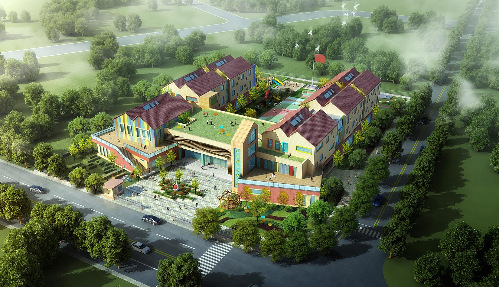 建筑造型來源于兒童最初對房子的印象并進行延伸,加上積木搭接形態(tài),形成C字形圍合的主體建筑,就像父母溫暖的懷抱;建筑造型跟兒童產生很好的親切感,讓兒童將上幼兒園成為快樂的事情。同時形態(tài)結合地緣文化特色,采用雙折坡屋頂,寓意展翅翱翔的海鷗。