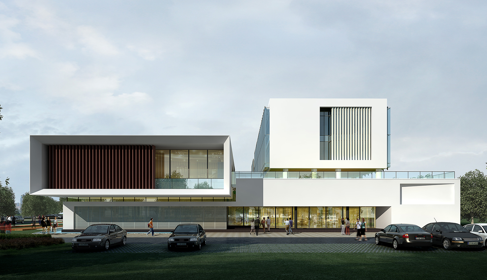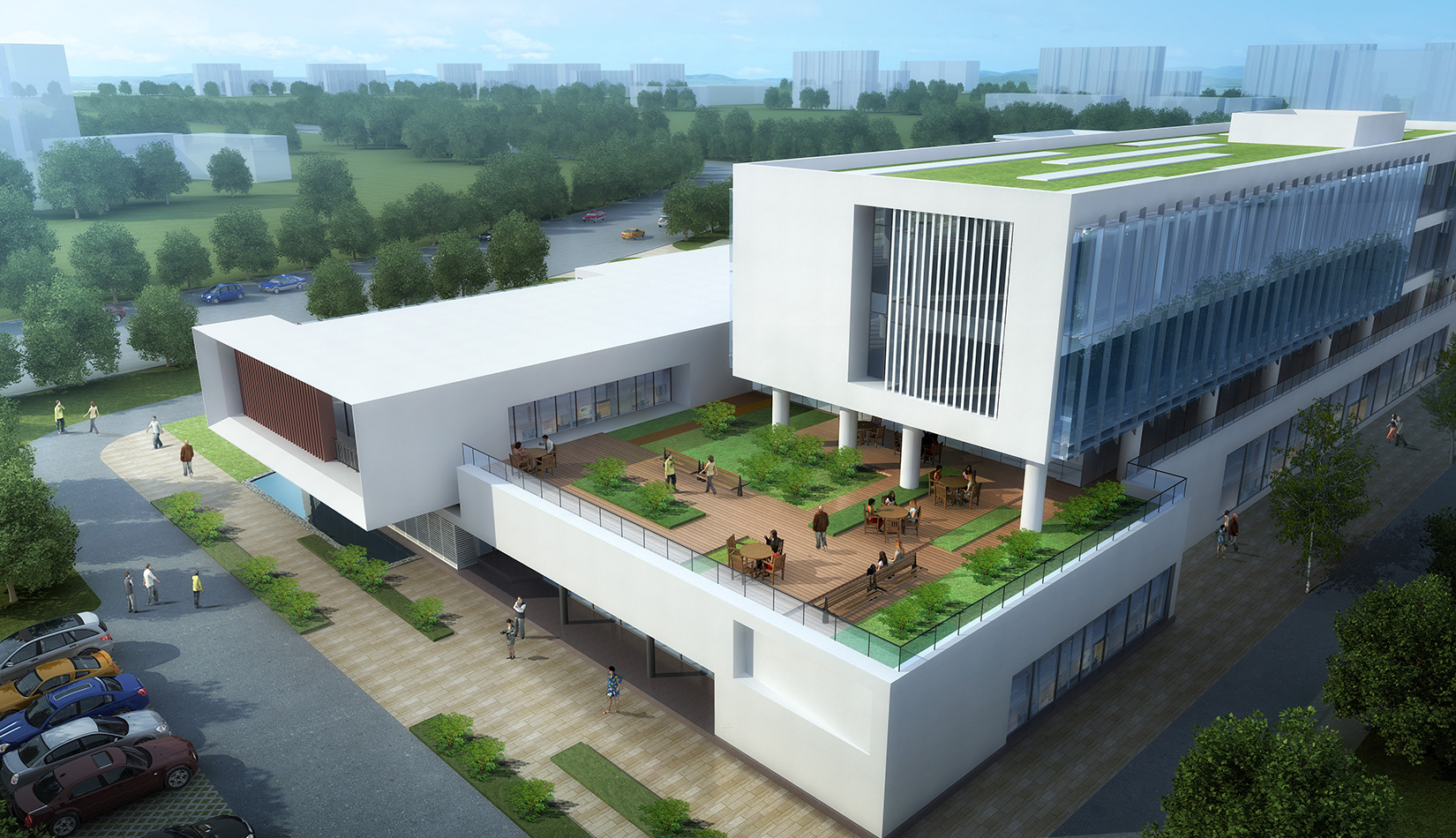 作為中韓貿易合作區(qū)一期啟動區(qū)的重點項目,其承擔著對外展示以及為后續(xù)發(fā)展提供服務平臺的功能。因此設計力求穩(wěn)重大氣,以4 層的體量打造出地標性的建筑。設計運用簡潔的外形、寧靜的色彩,外立面以白色涂料和木格柵為主,尊重自然,打造一種平和寧靜的感覺。在空間設計上通過共享空間、上人露臺和一層大平臺,創(chuàng)造出舒適宜人的工作環(huán)境;在技術上通過地源熱泵、呼吸式幕墻、雨水收集等的應用,實現(xiàn)建筑的綠色節(jié)能環(huán)保。