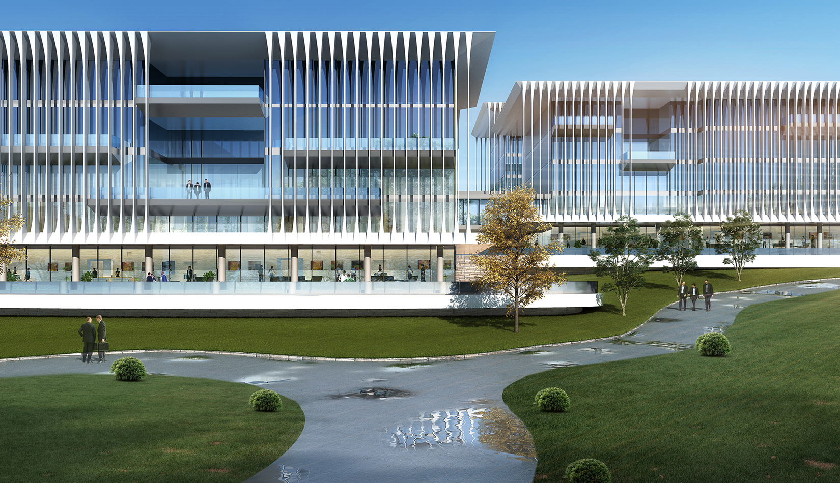 建筑立面采用疏密有致的格柵化立面,凸顯了預警基地的嚴肅性;白色流線型屋頂順應地勢,給建筑賦予現(xiàn)代的海洋氣息。不同的建筑功能合理布局,沿海建筑采用退臺的建筑手法,沿海岸線立面生動活潑。